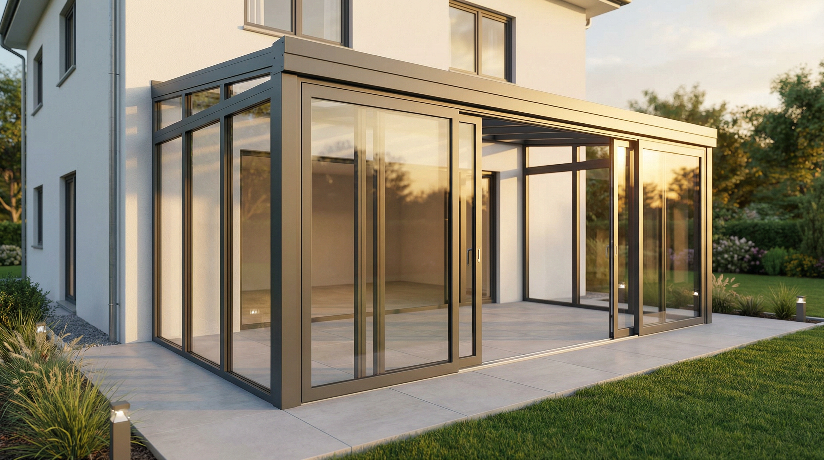 Unser modulares System macht's möglich: Starten Sie mit einem Terrassendach und erweitern Sie später mit Glasschiebeelementen oder festen Seitenwänden zum geschützten Kaltwintergarten.